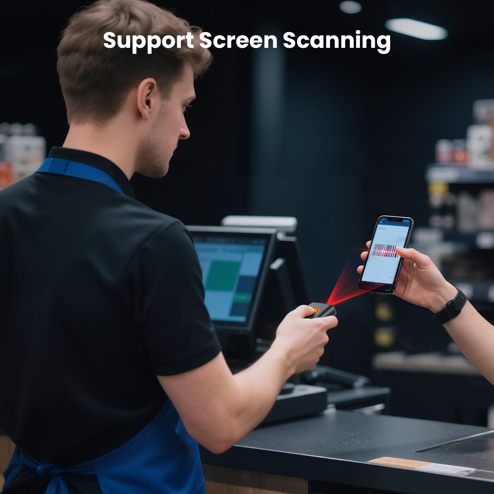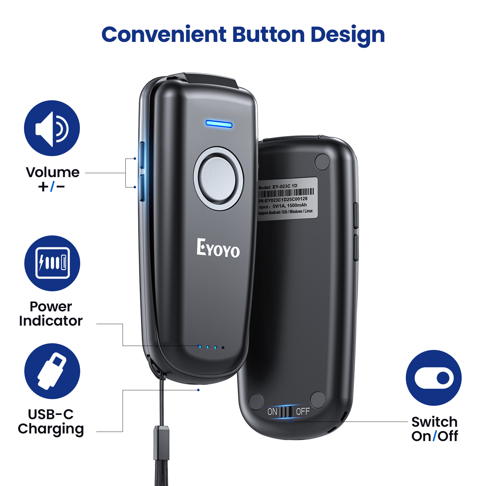 Eyoyo Mini 1D Bluetooth Barcode Scanner Wireless, With Power On/Off Button, Volume Up/Down Button,1500mAh Rechargeable Battery, Portable Bar Codes Reader for Windows, Mac Computer, Android, iOS Phones